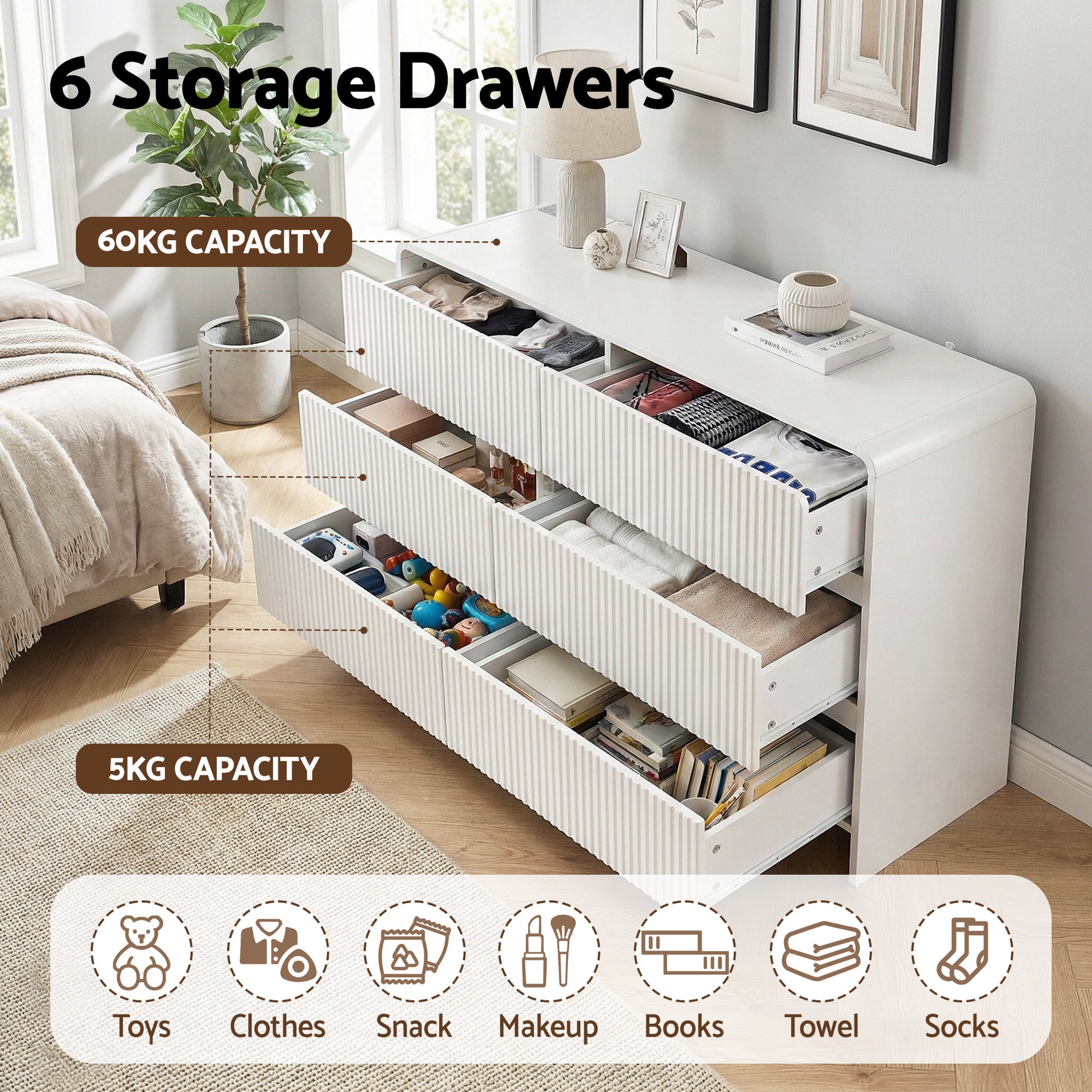 Introduce stylish order to your home with this modern chest of drawers. Featuring six generous storage drawers with smooth-gliding runners and a convenient push-to-open design, this versatile dresser makes organising your bedroom, living room, or hallway a breeze. Crafted with a focus on durability, this sturdy lowboy boasts a high weight capacity (tabletop: 60kg, each drawer: 5kg), a scratch-resistant finish, and includes a safety anti-tip kit. Its elegant fluted front and rounded corner edges add a contemporary touch to any space. This practical storage cabinet is also perfect for your home office or study. Easy to clean and designed for daily use, it's the perfect solution for decluttering and elevating your room's style.